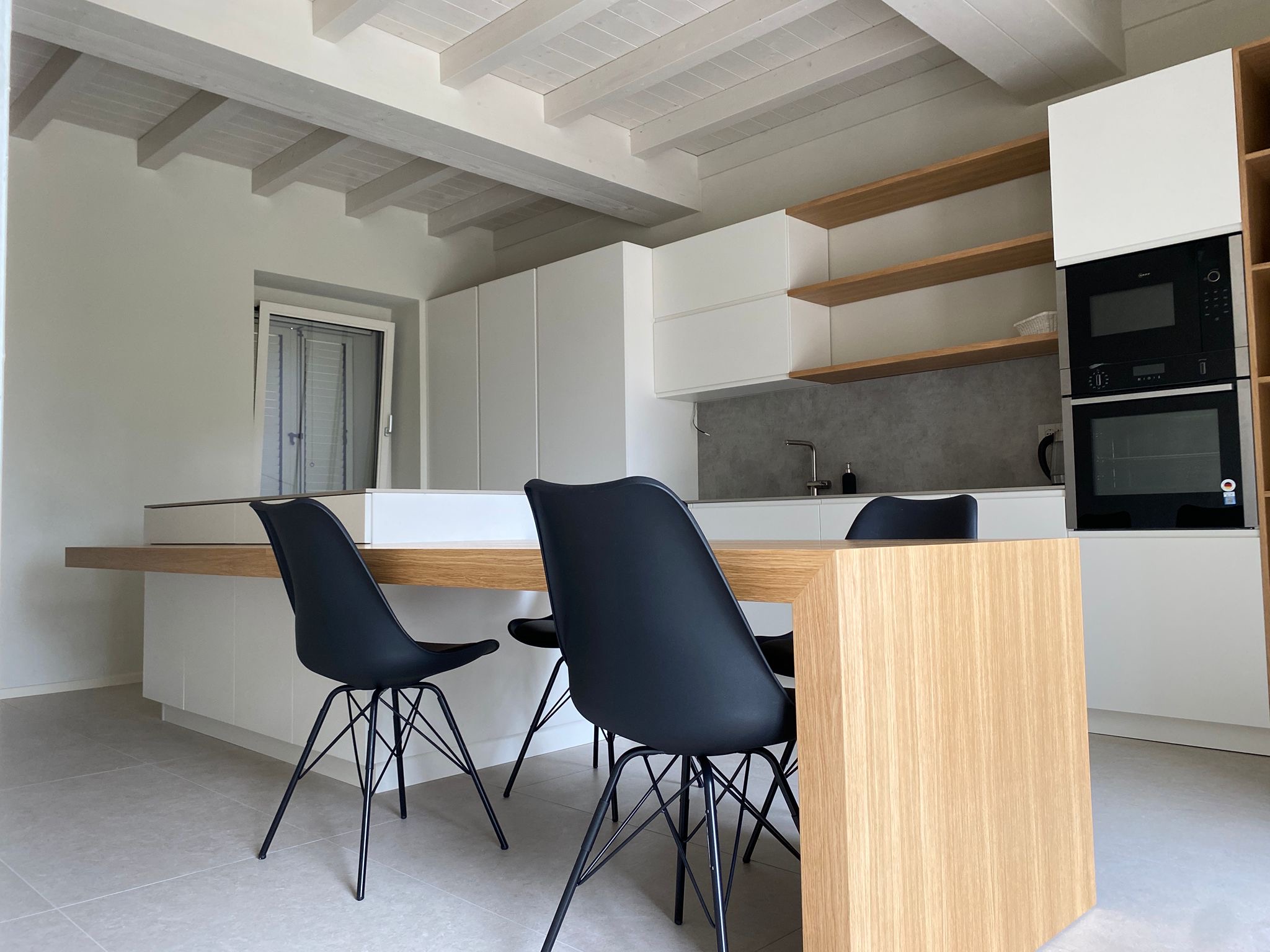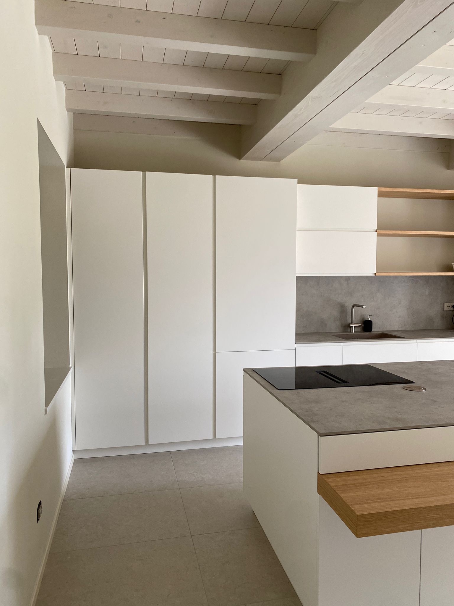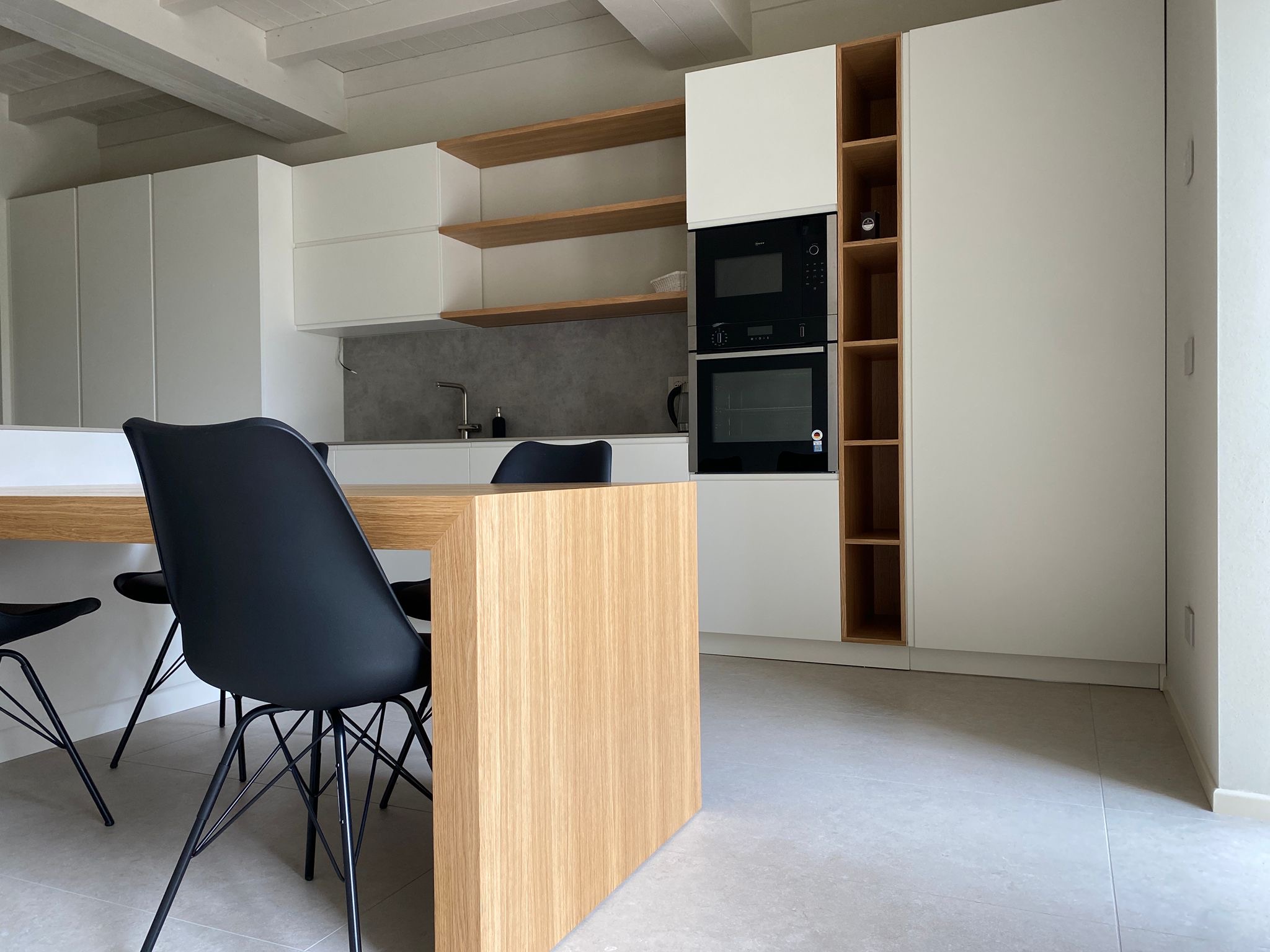 Cucina con colonna iniziale, con sportelli a scomparsa totale e vassoio estraibile. Sportelli con maniglie a gola laccati RAL 9010, isola centrale con integrato tavolo in Rovere verniciato al naturale. Finto sportello finale simil porta per accesso alla stanza comunicante.