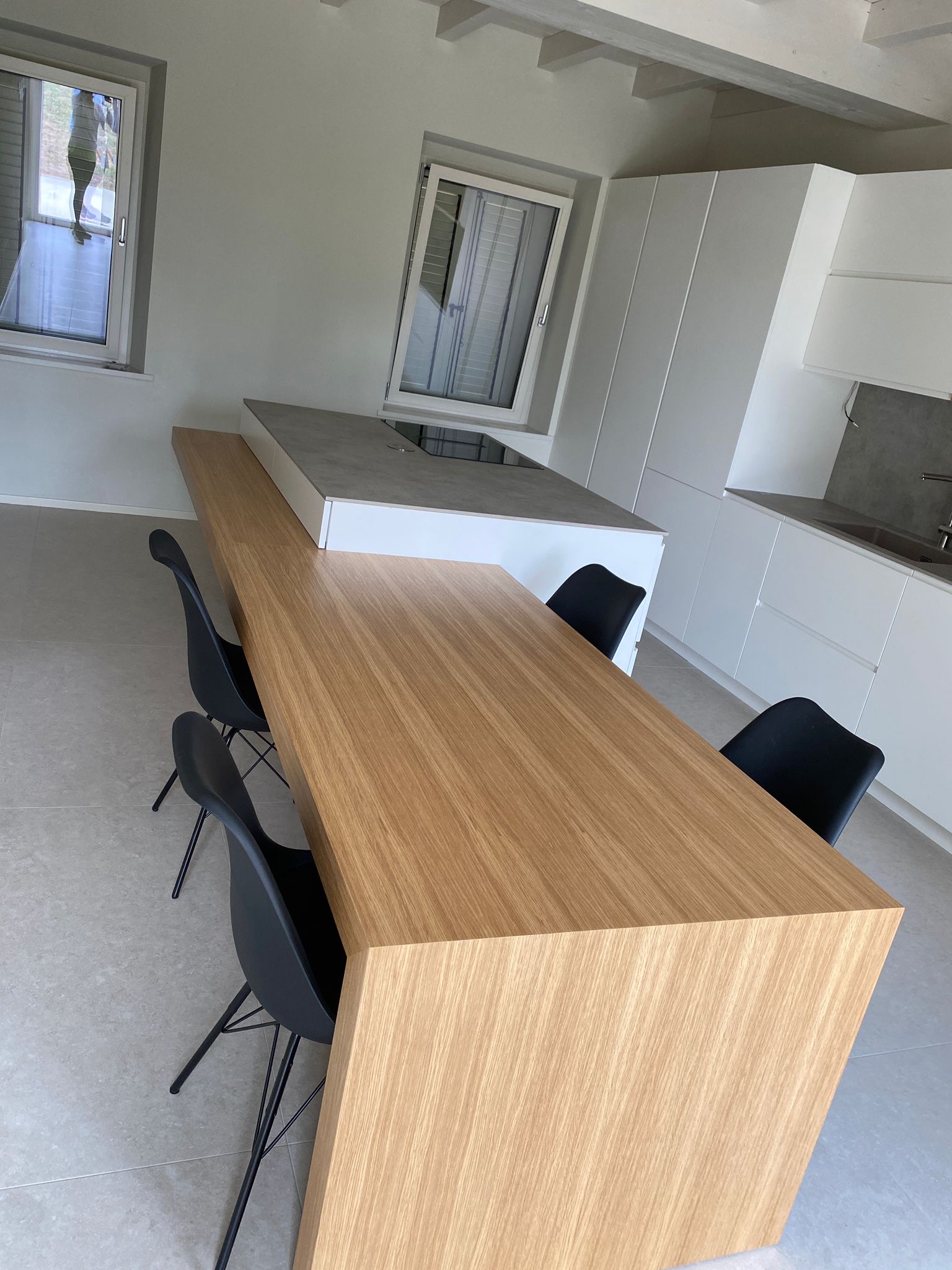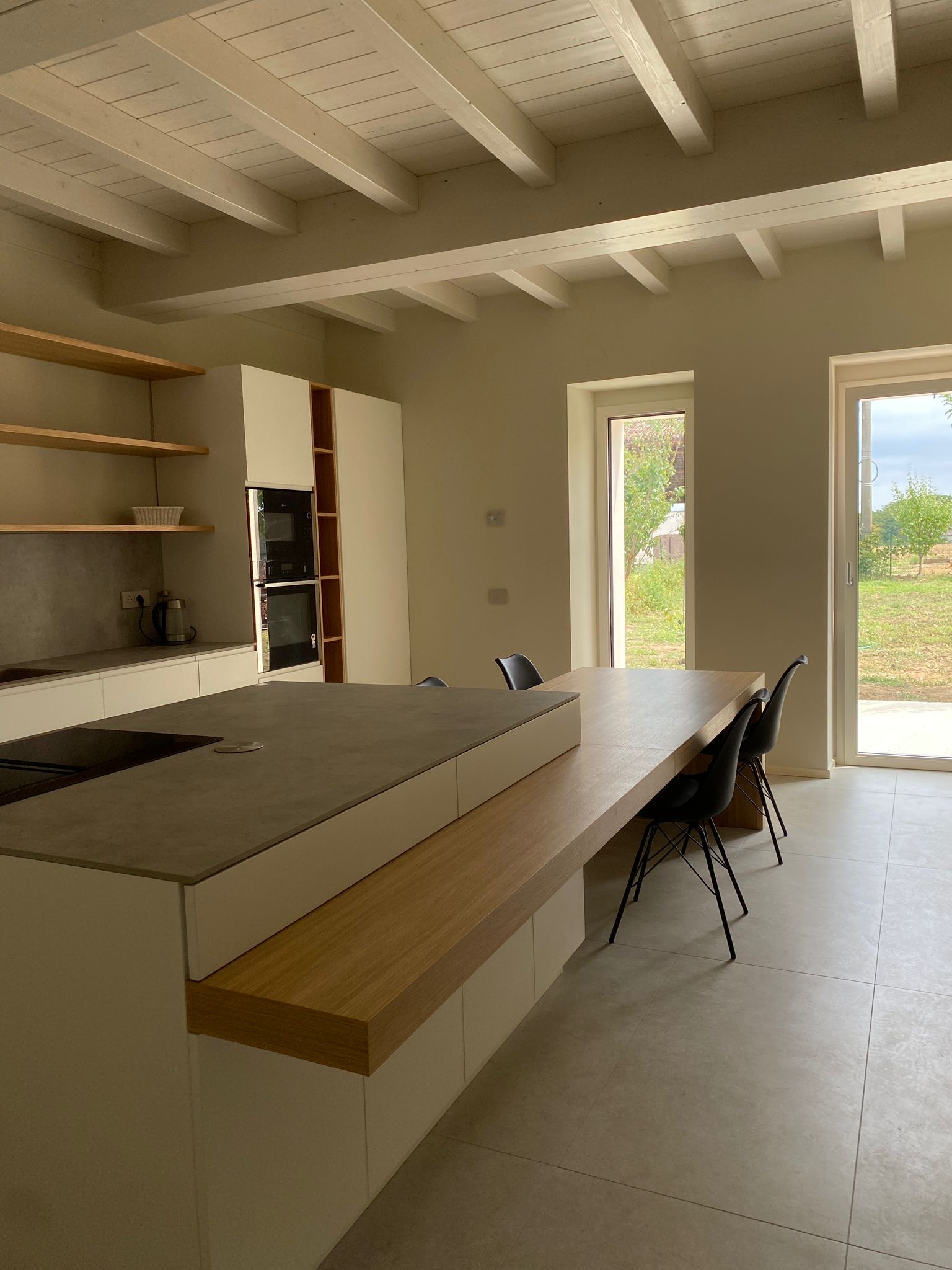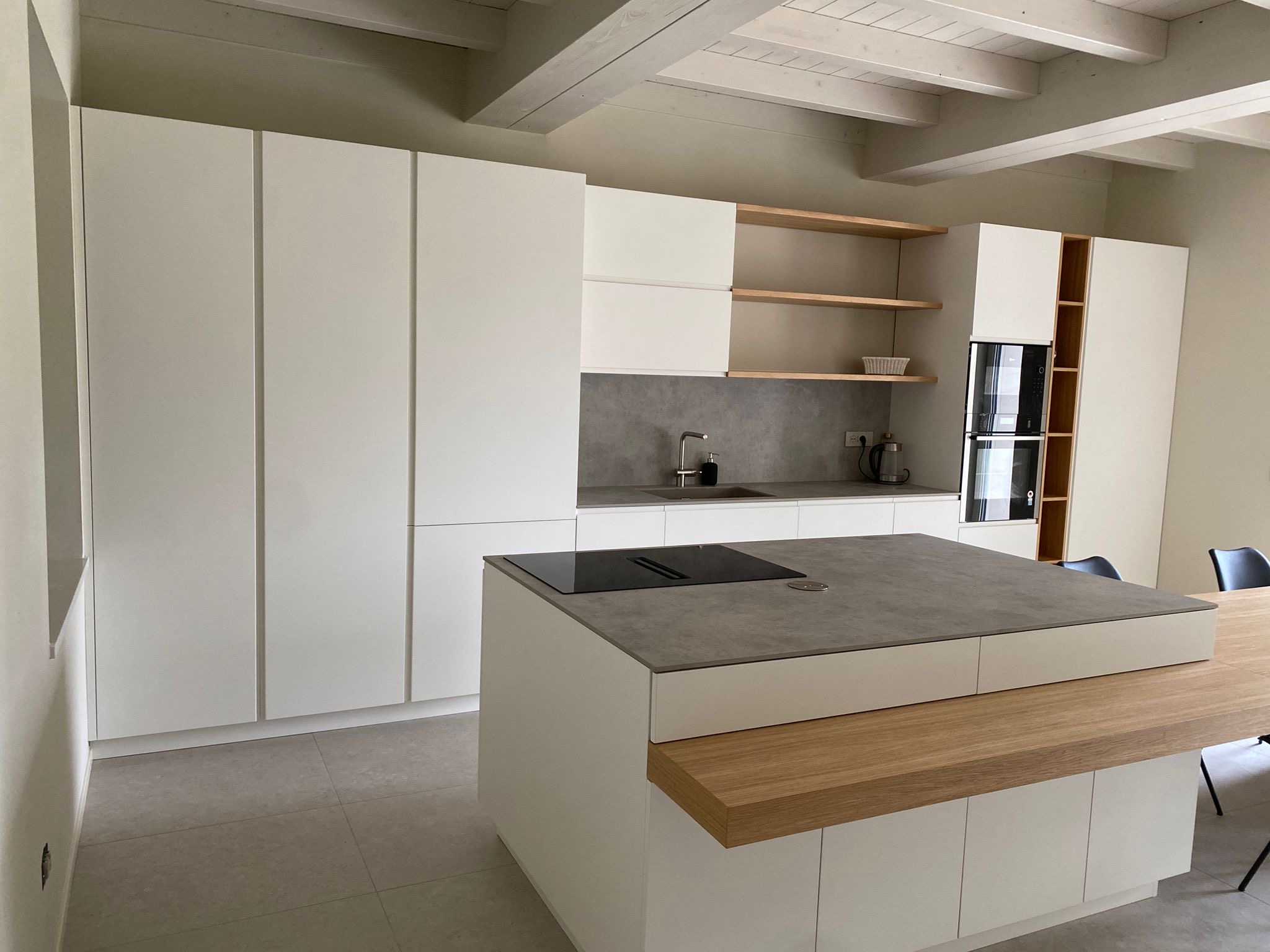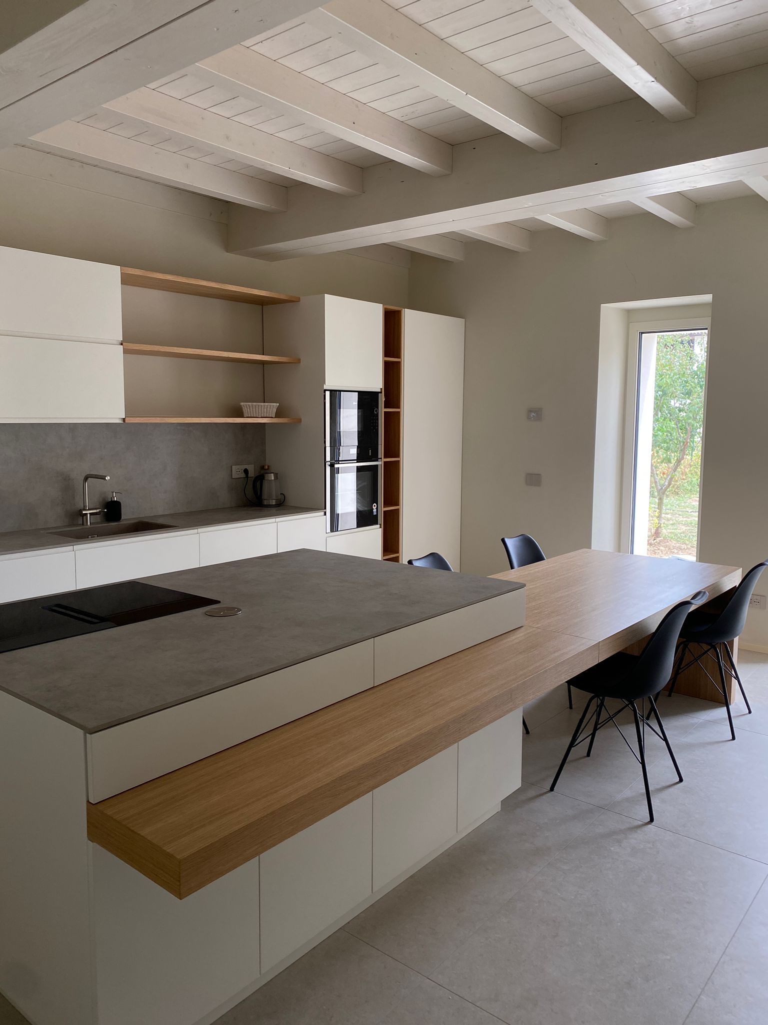 Cucina con colonna iniziale, con sportelli a scomparsa totale e vassoio estraibile. Sportelli con maniglie a gola laccati RAL 9010, isola centrale con integrato tavolo in Rovere verniciato al naturale. Finto sportello finale simil porta per accesso alla stanza comunicante.