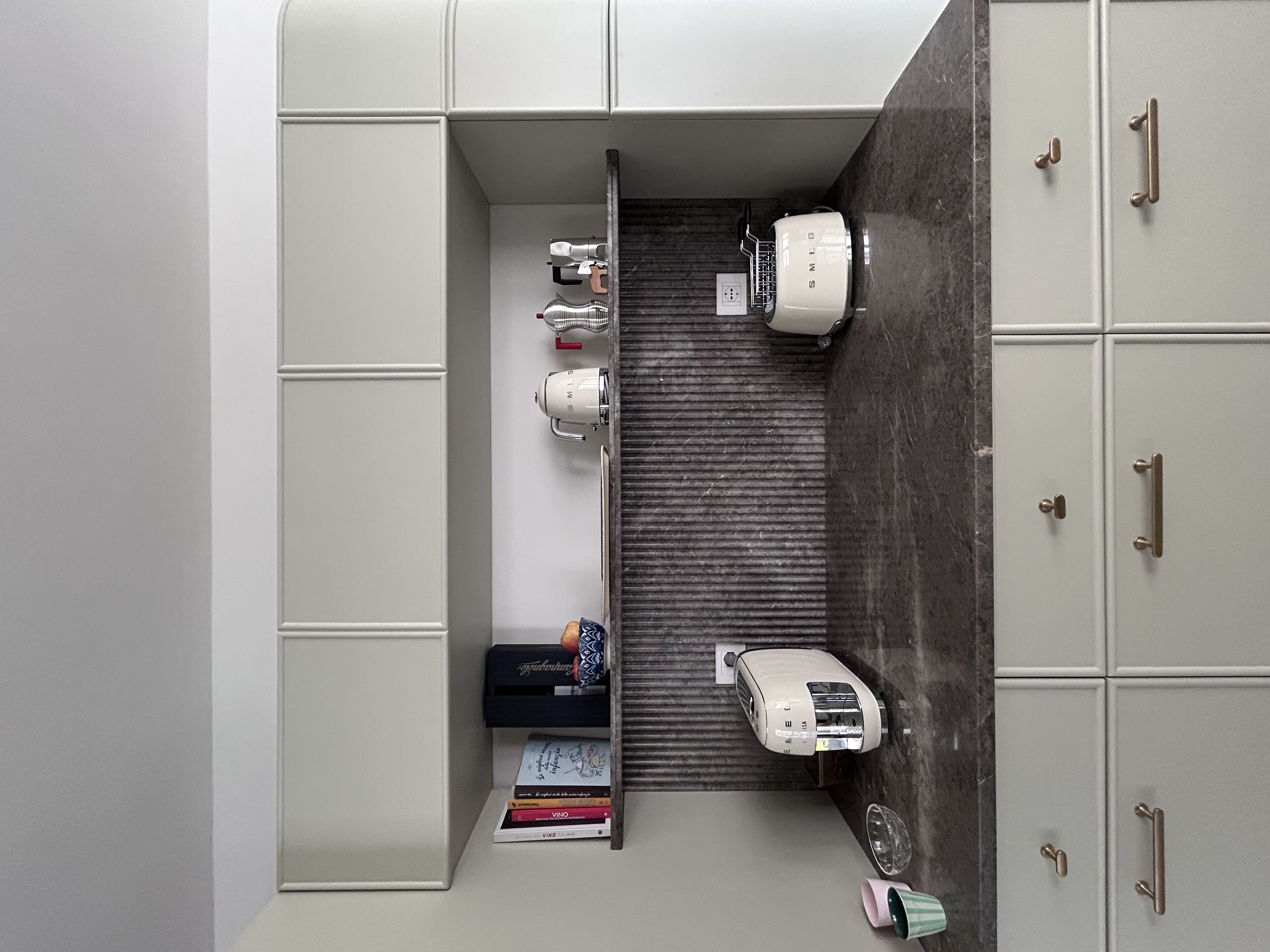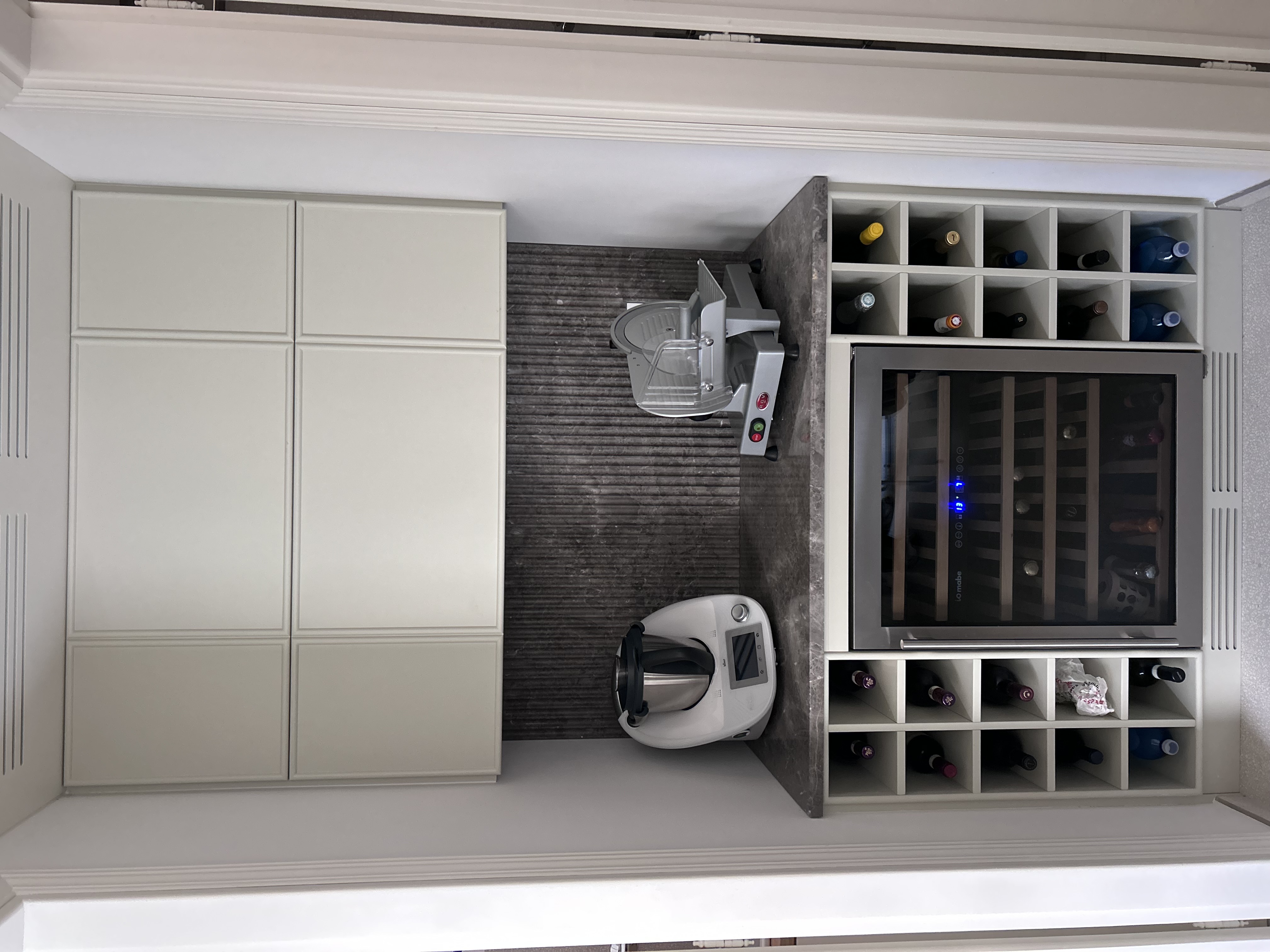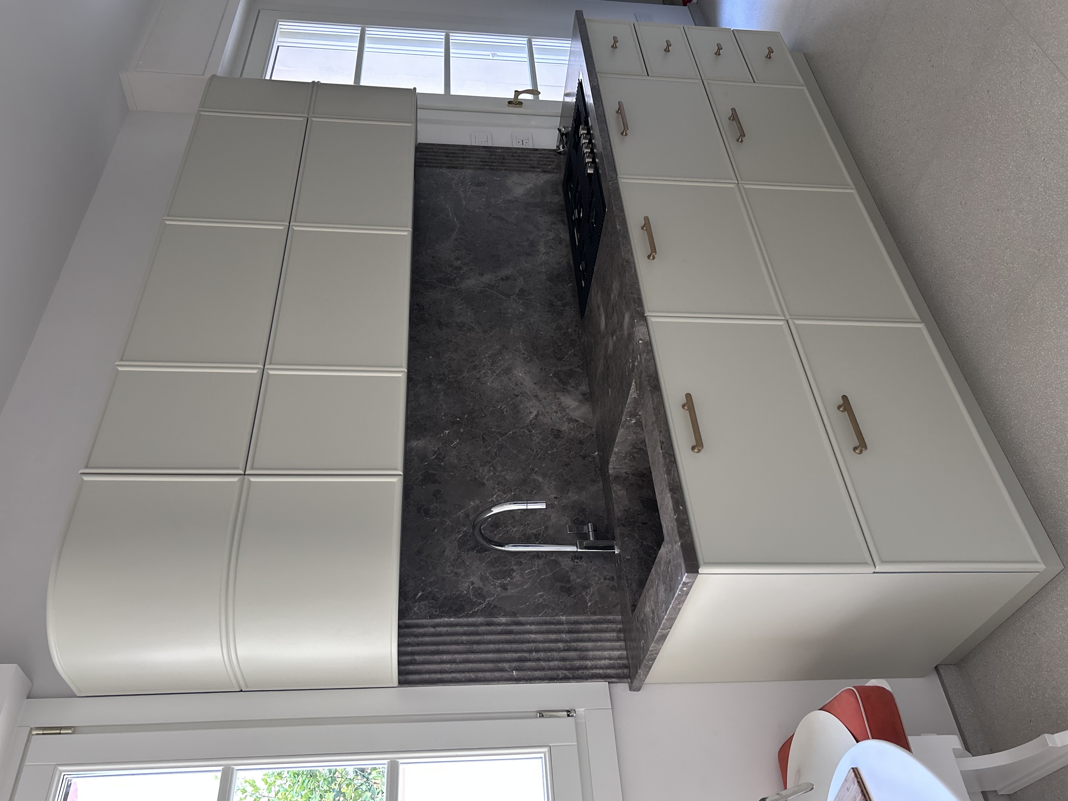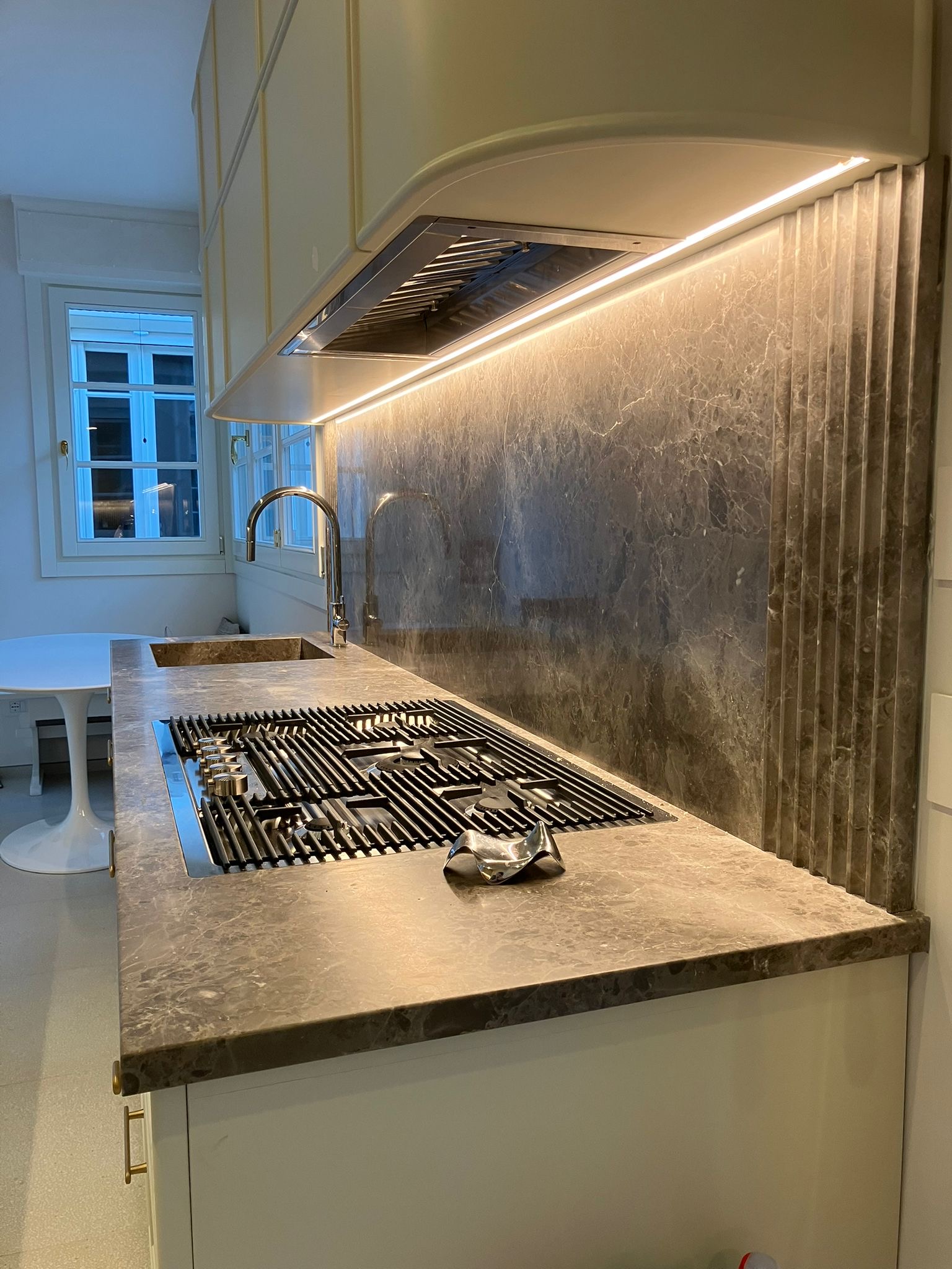 Cucina laccata con elementi e sportelli stondati con cornice perimetrale, laccatura colore a campione, marmo “fior di bosco”, alzate marmo “fior di bosco” cannettate.