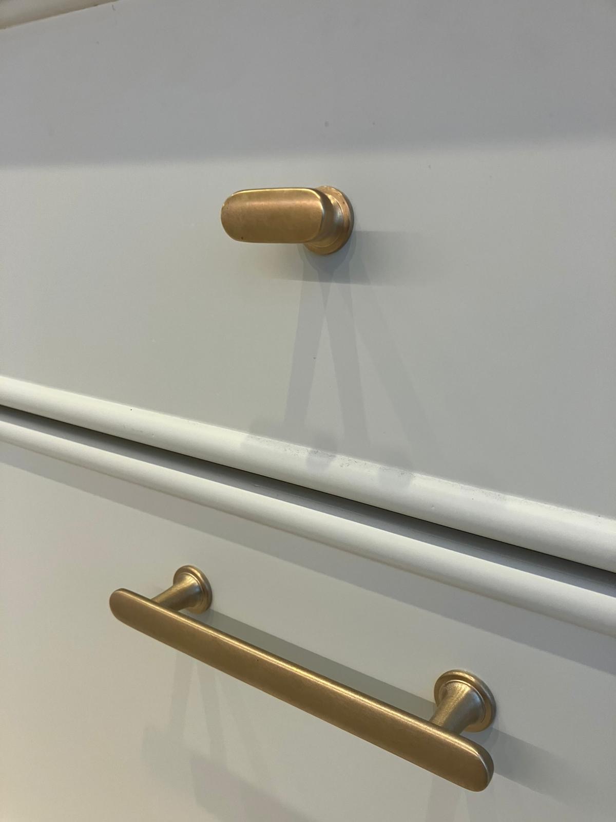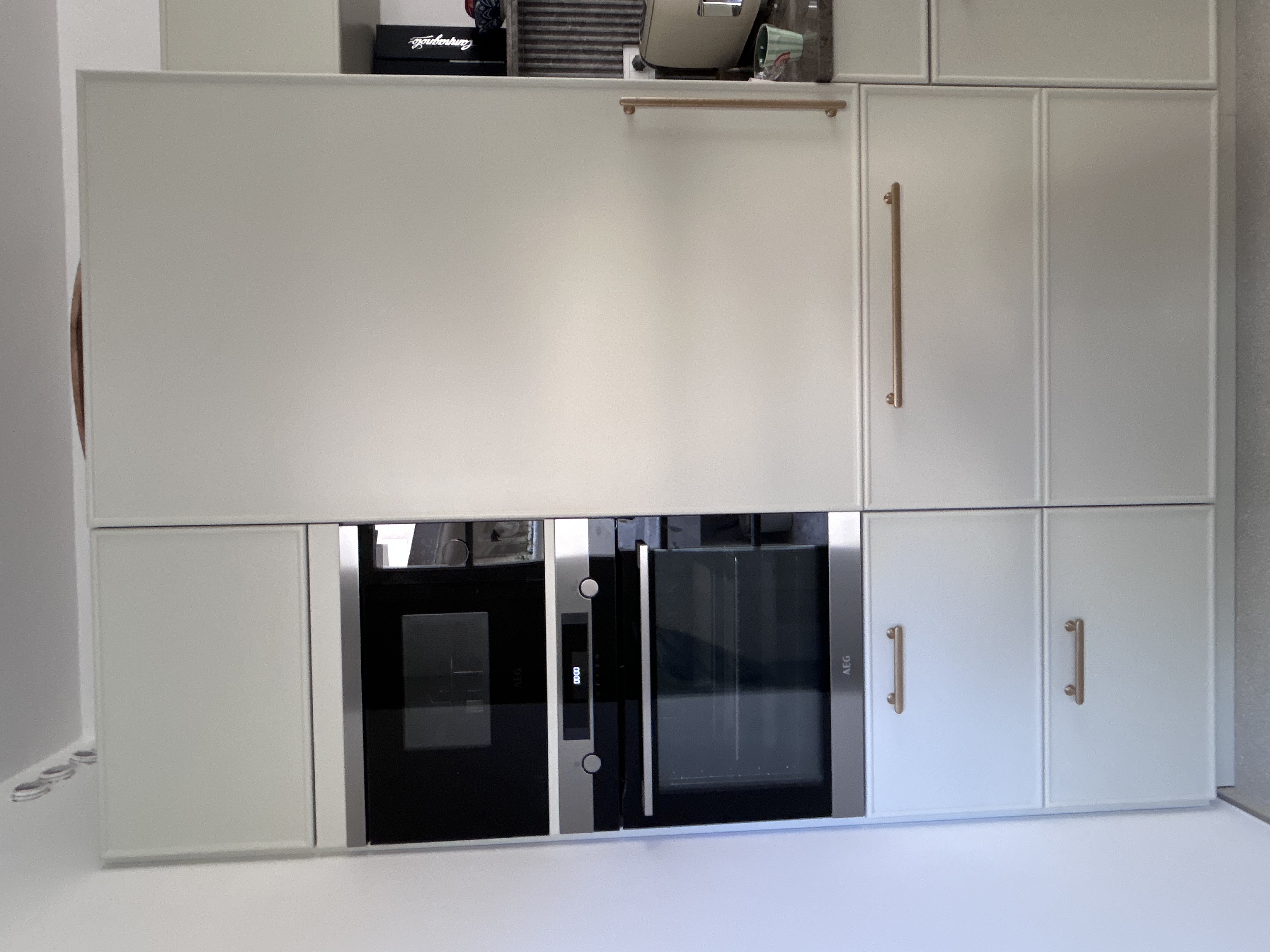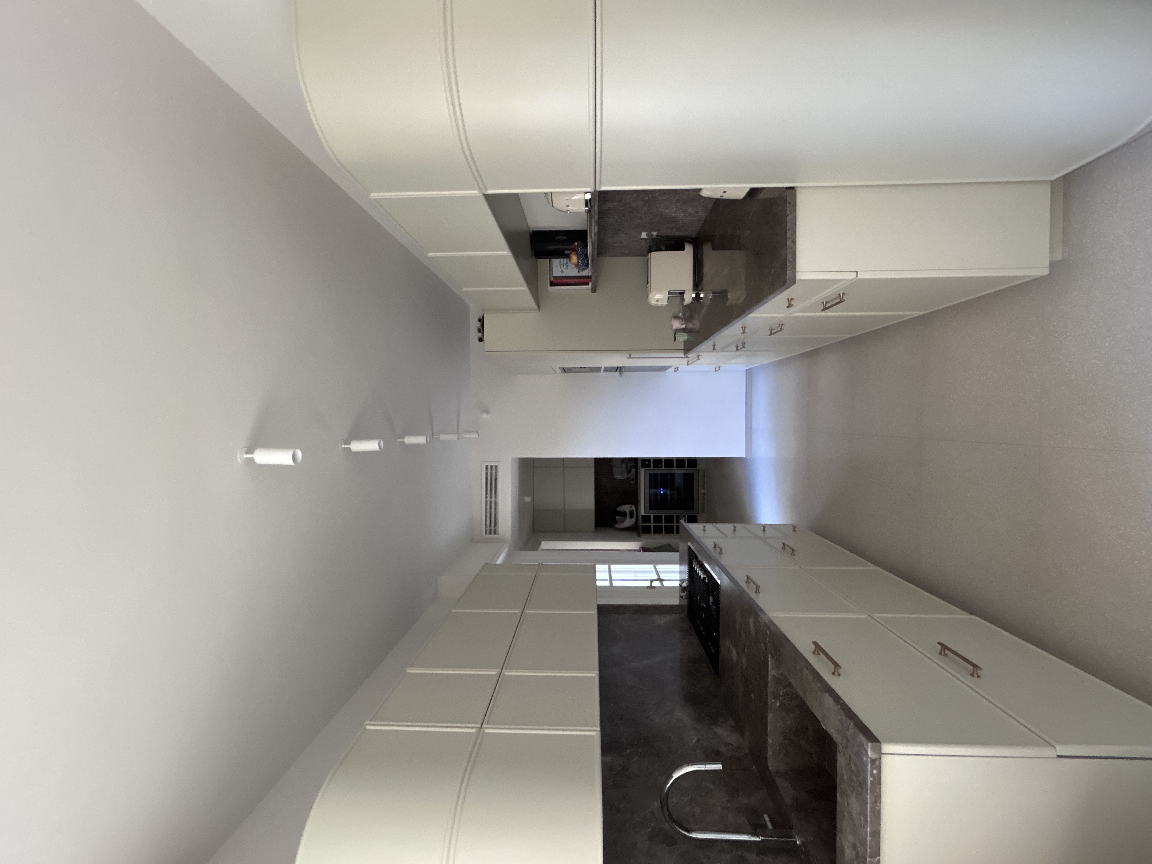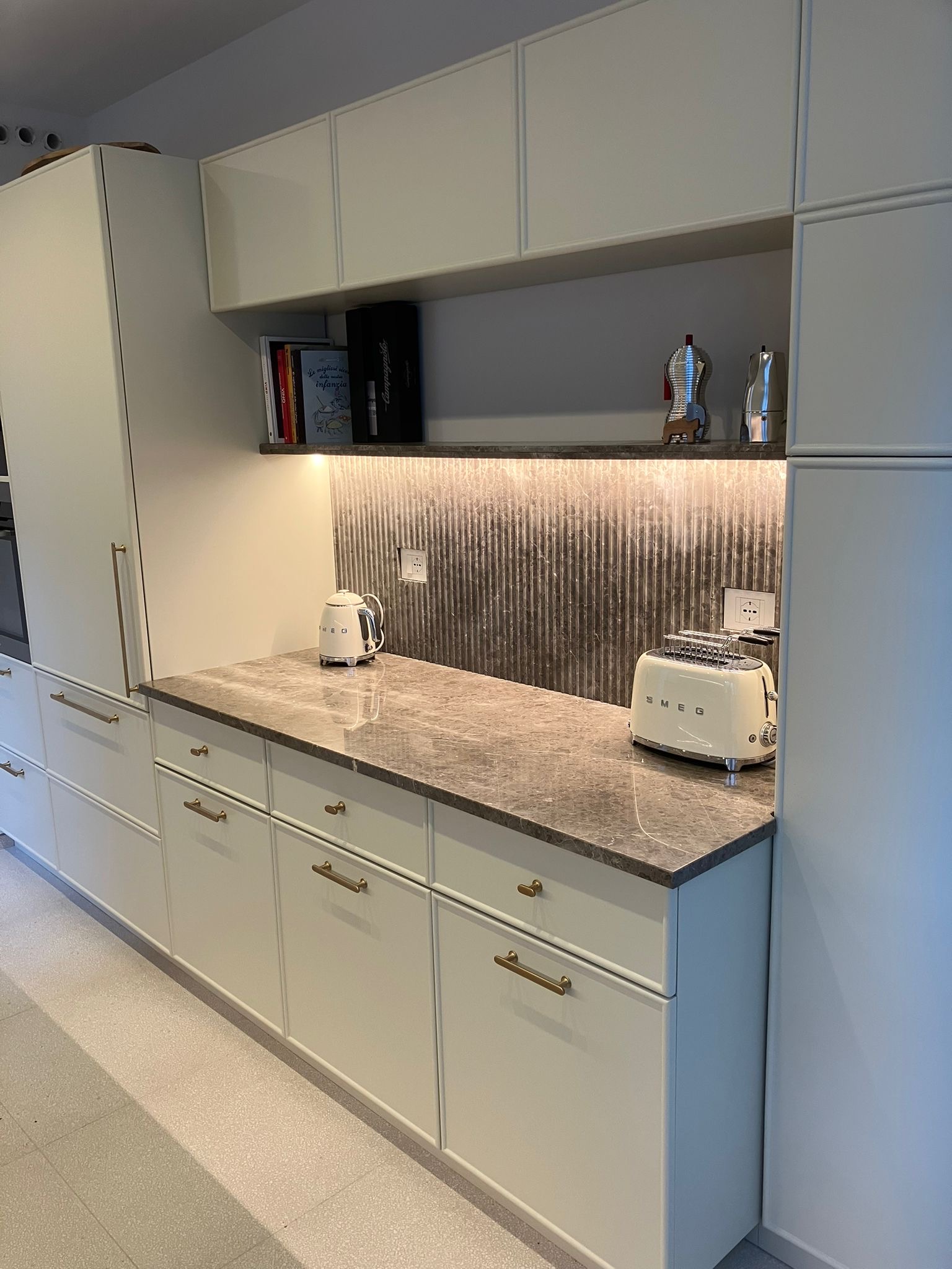Cucina laccata con elementi e sportelli stondati con cornice perimetrale, laccatura colore a campione, marmo “fior di bosco”, alzate marmo “fior di bosco” cannettate.
