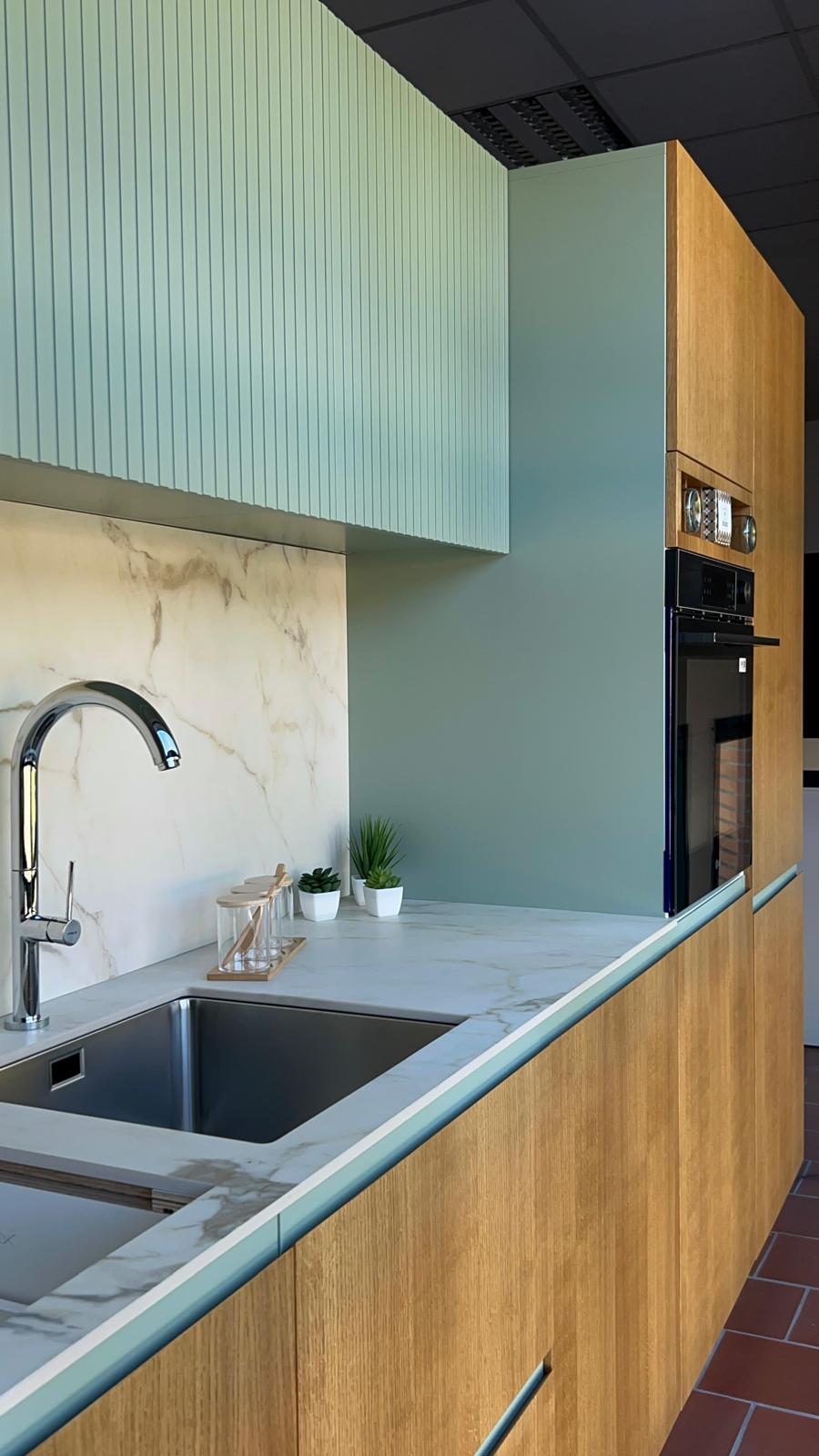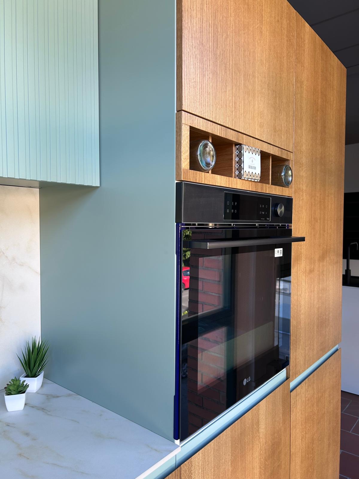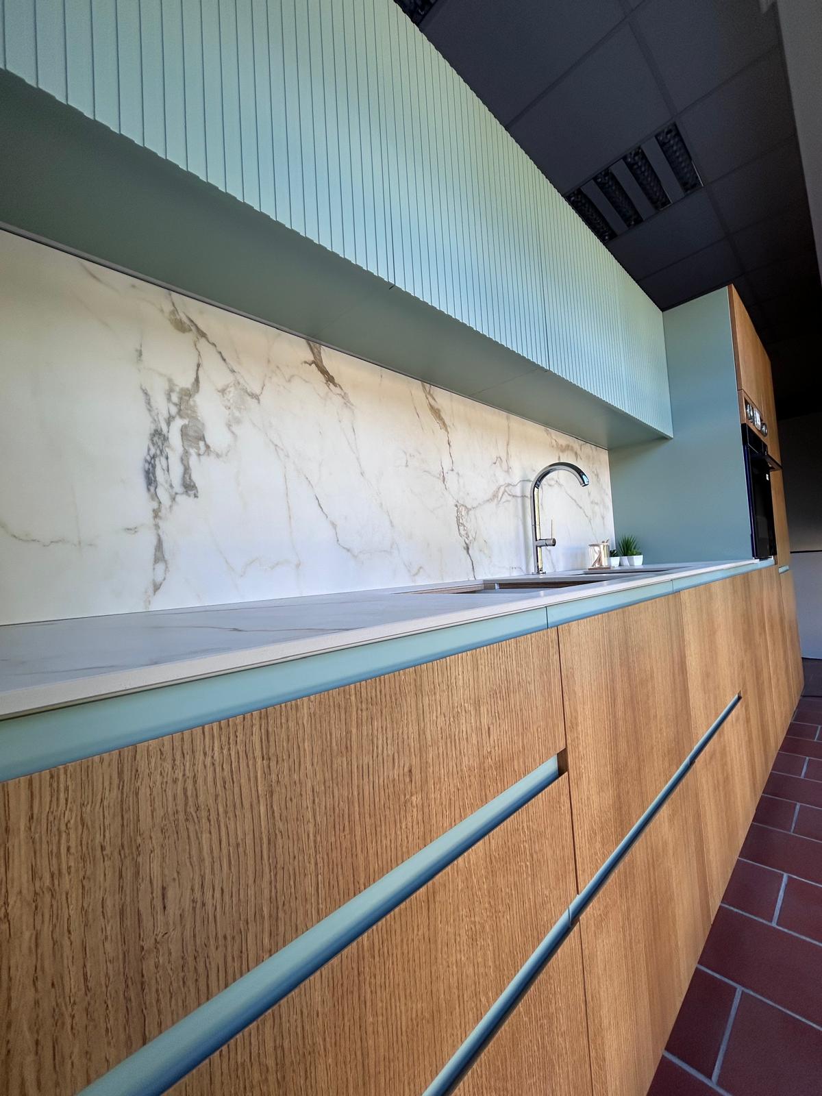 Cucina con sportelli dogati laccati che riprendono le maniglie a gola degli sportelli sottostanti al piano di lavoro. Piccola parte a giorno ad uso cantinetta in rovere, come gli sportelli sottostanti al piano di lavoro. Cucina completa di top, illuminazione ed elettrodomestici.