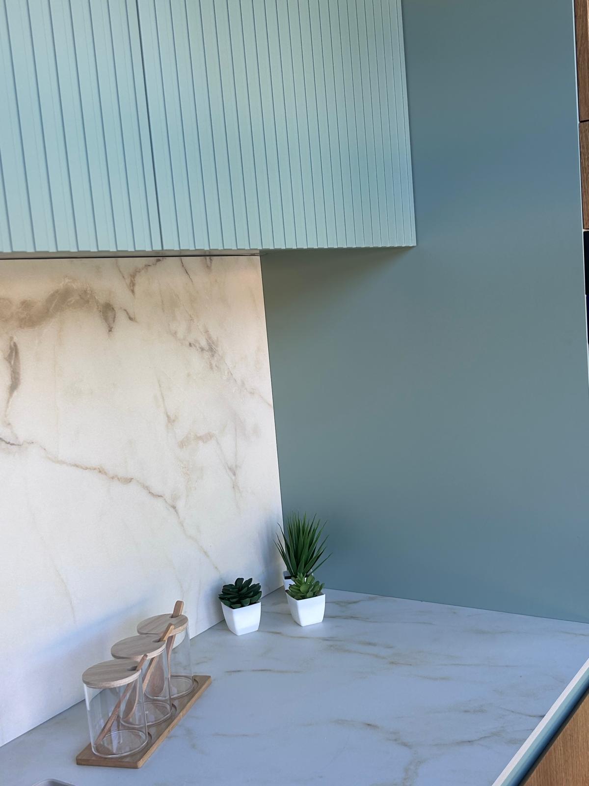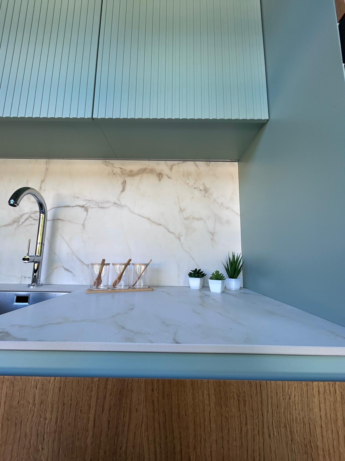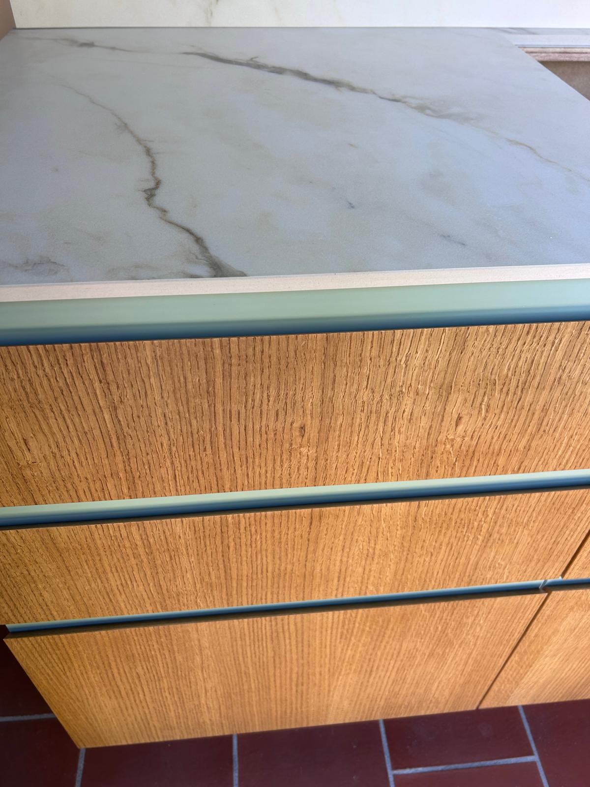 Cucina con sportelli dogati laccati che riprendono le maniglie a gola degli sportelli sottostanti al piano di lavoro. Piccola parte a giorno ad uso cantinetta in rovere, come gli sportelli sottostanti al piano di lavoro. Cucina completa di top, illuminazione ed elettrodomestici.