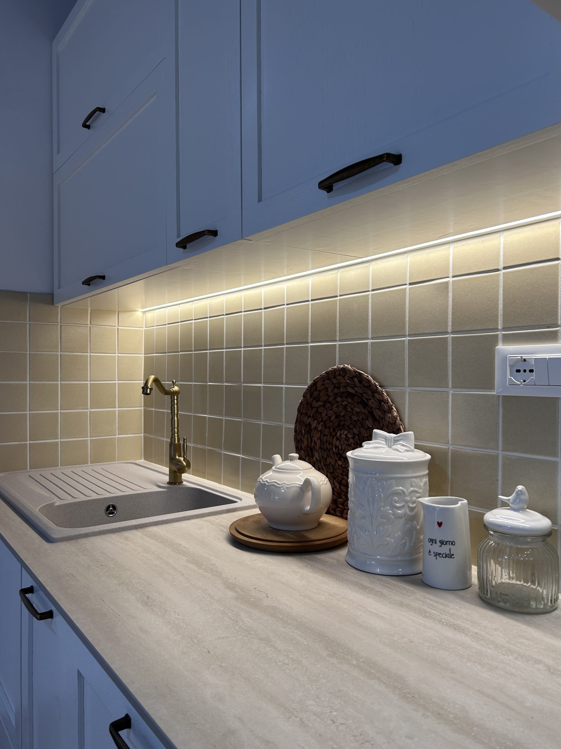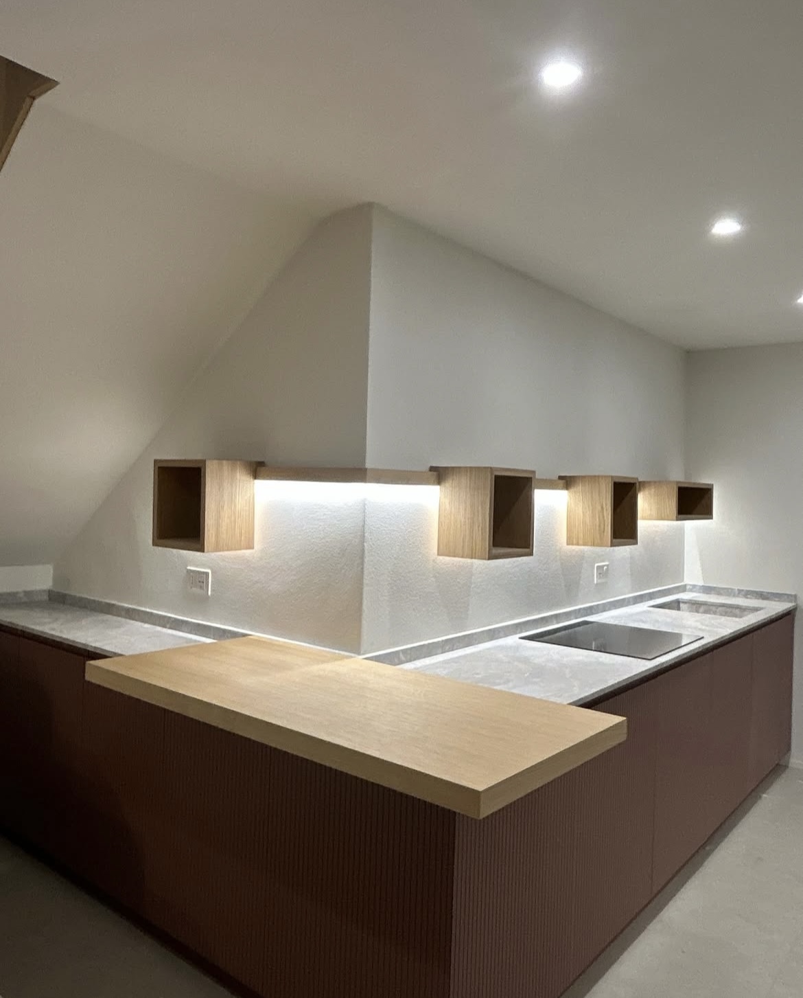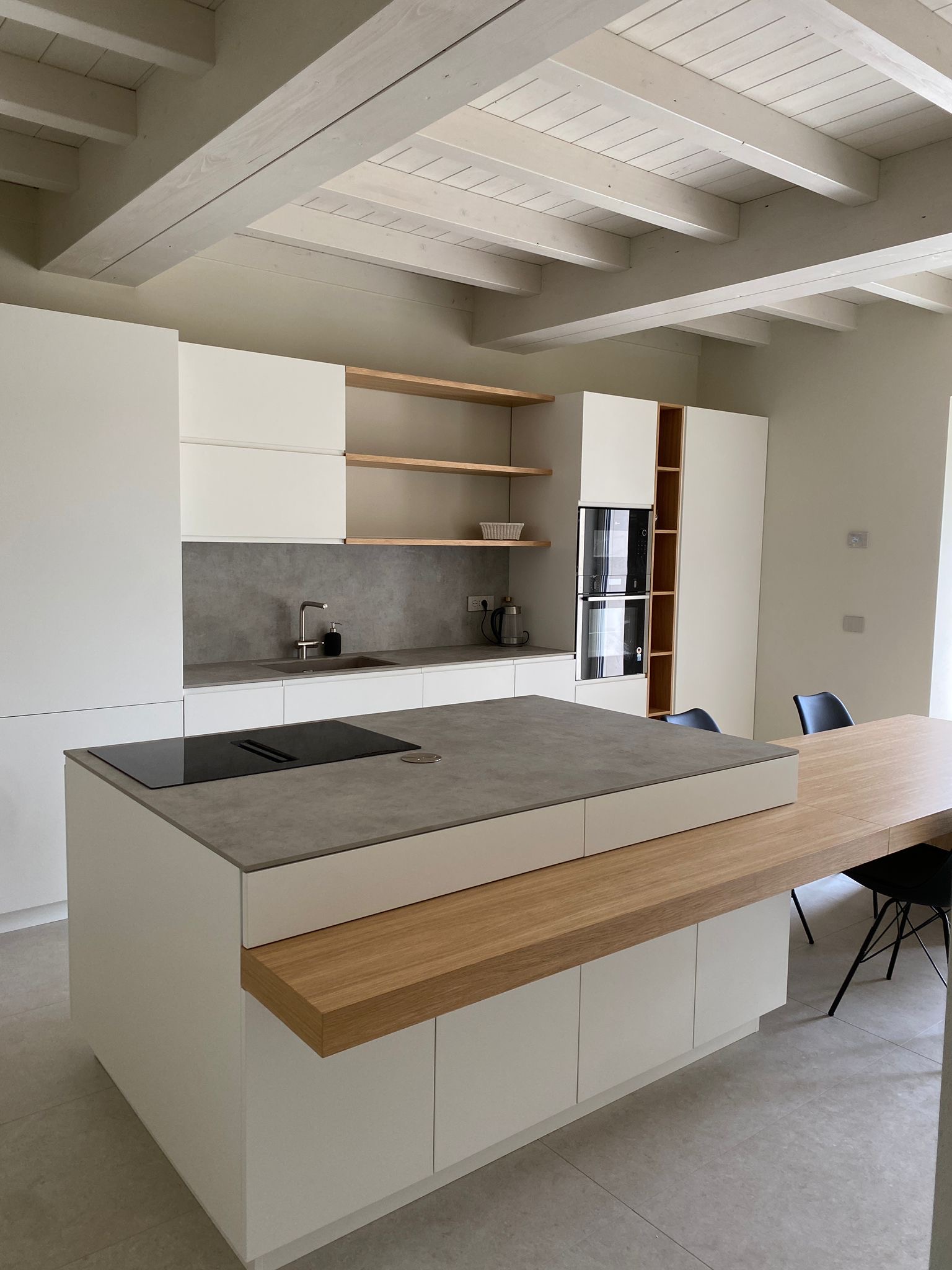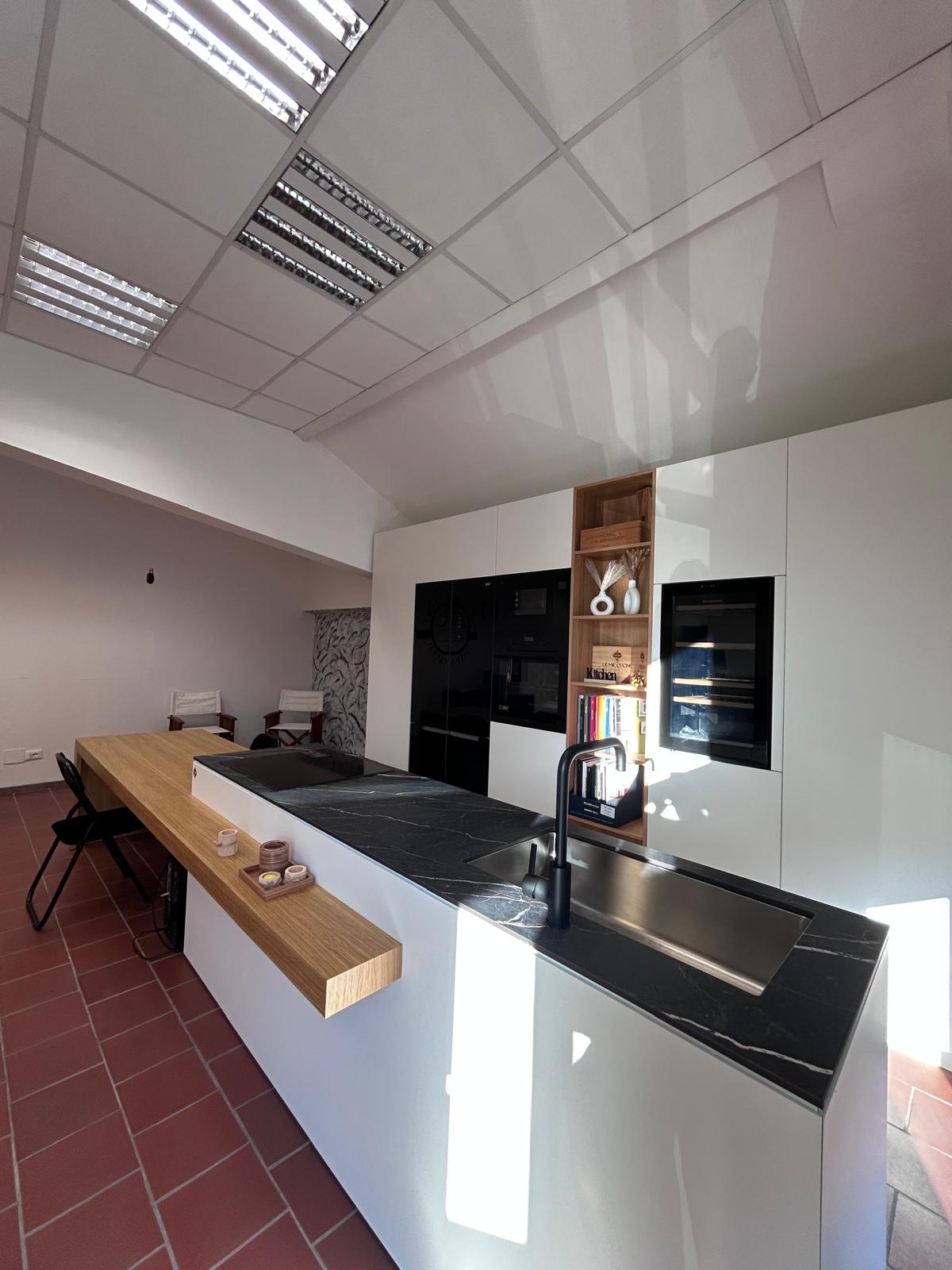 Cucina con sportelli dogati laccati che riprendono le maniglie a gola degli sportelli sottostanti al piano di lavoro. Piccola parte a giorno ad uso cantinetta in rovere, come gli sportelli sottostanti al piano di lavoro. Cucina completa di top, illuminazione ed elettrodomestici.