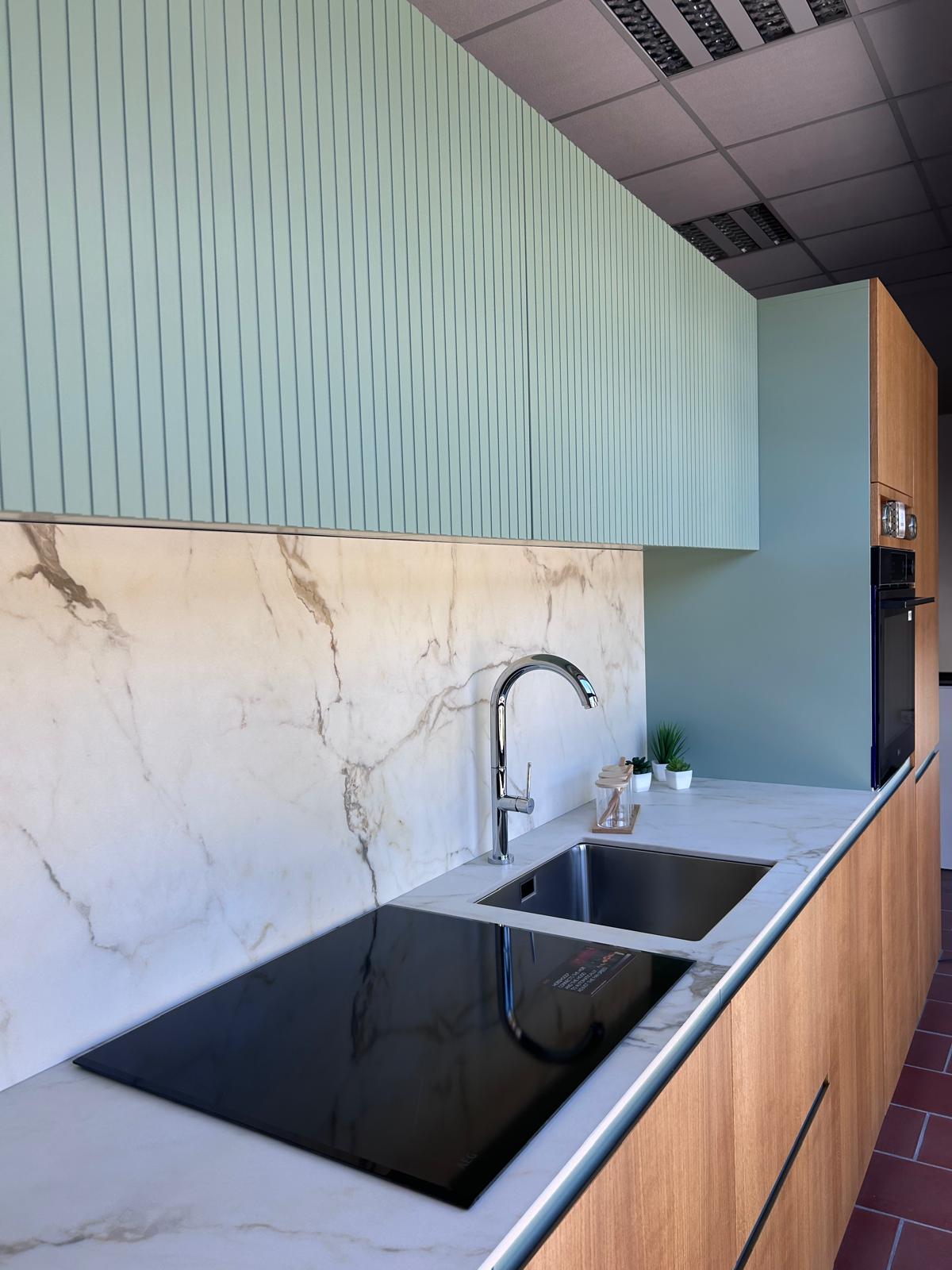 Cucina con sportelli dogati laccati che riprendono le maniglie a gola degli sportelli sottostanti al piano di lavoro. Piccola parte a giorno ad uso cantinetta in rovere, come gli sportelli sottostanti al piano di lavoro. Cucina completa di top, illuminazione ed elettrodomestici.